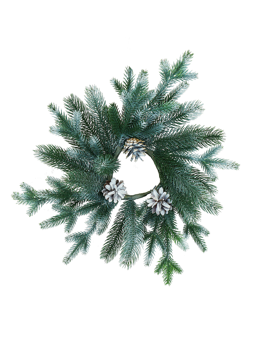 Венок новогодний - 21 зеленый с шишками заснеженный литыми побегами, d-40 см. (1)