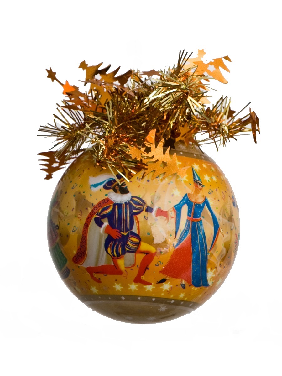 Шар "Рождественский" 8,5 см из пластика с ярким рисунком в тематике венецианского карнавала и короной из мишуры. Небьющееся, безопасное украшение для новогодней ели. Рисунок на пленке. Производитель: MOROZCO (Россия).