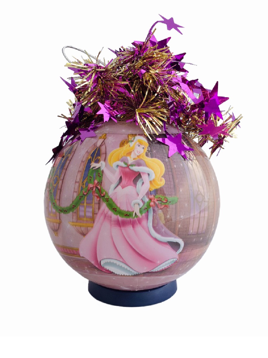 Шар "Спящяя красавица Аврора" 95 мм из пластика с ярким рисунком и короной из мишуры. Небьющееся, безопасное украшение для новогодней ели. Рисунок по мотивам сюжетов Уолт Дисней на пленке - нежная красавица Аврора в розовом платье. Производитель: MOROZCO (Россия).