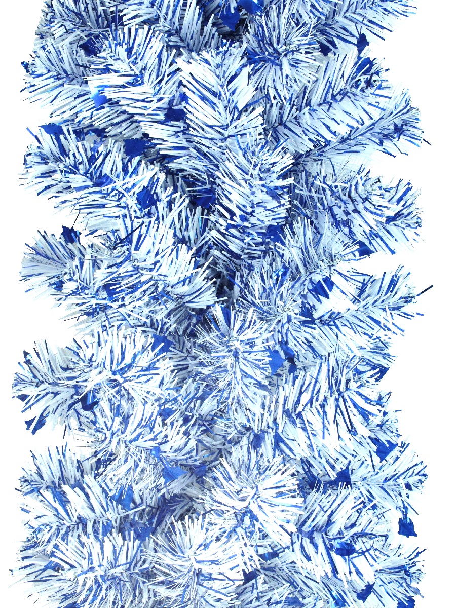 Густая хвойная гирлянда снежно-белого цвета с короткими пушистыми отростками. Белоснежные иголочки хвои перемежаются с иголочками темно-синей мишуры с вплетенными штампами.